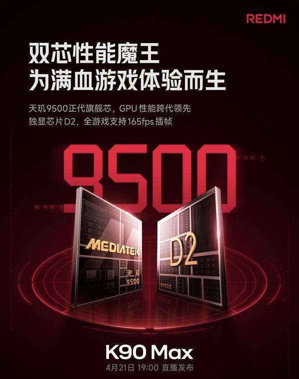 4月14日,小米集团合伙人、总裁,手机部总裁,小米品牌总经理卢伟冰宣布,REDMI K90 Max搭载天玑9500+独显芯片D2双芯组合,支持全游戏165fps插帧。产品将于4月21日19:00发布。