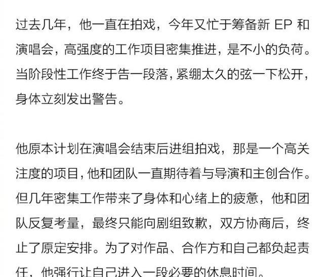 他写了封亲笔信给剧组:道歉,把全部违约金由自己承担,并保证恢复健康后再合作。 这封信没有在网络上公开,剧组人员却主动透露了细节,原因只是“他字里行间太真诚”。