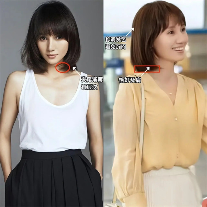 你的头发是齐肩短发,发尾稍微薄一点,但一定要有层次感,长度刚好到肩部位置,同时,发尾一定要做一个小内扣的裁剪,这样打理起来,整体发型看起来才会好看。